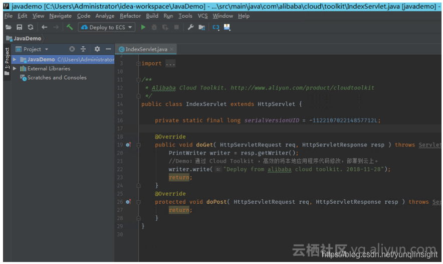 public class IndexServlet extends HttpServlet {private static final long serialVersionUID = -112210702214857712L;@Overridepublic void doGet( HttpServletRequest req, HttpServletResponse resp ) throws ServletException, IOException {PrintWriter writer = resp.getWriter();//Demo:通过 Cloud Toolkit ,高效的将本地应用程序代码修改,部署到云上。writer.write("Deploy from alibaba cloud toolkit. 2018-10-24");return;}@Overrideprotected void doPost( HttpServletRequest req, HttpServletResponse resp ) throws ServletException, IOException {return;}}源代码下载
