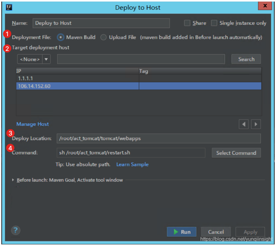 -  Deploy File:部署文件包含两种方式。 - Maven Build:如果当前工程采用 Maven 构建,可以使用 Cloud Toolkit 直接构建并部署。