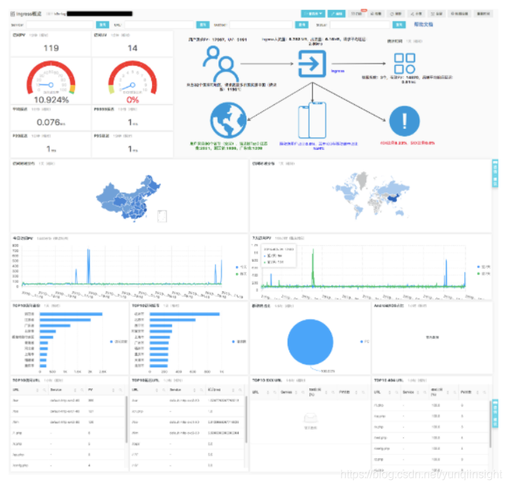 Ingress 访问中心主要侧重于用于访问请求相关的统计信息,一般用于运营分析,包括:当日 UV/PV、UV/PV 分布、UV/PV 趋势、TOP 访问省份/城市、TOP 访问浏览器、TOP 访问IP、移动端占比、Android/IOS 占比等。