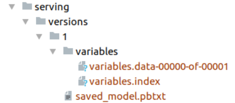 如果一切顺利,你将看到文件夹./serving/versions/1,请注意,“1”表示模型的当前版本。在每个版本子目录中,你将看到以下文件: