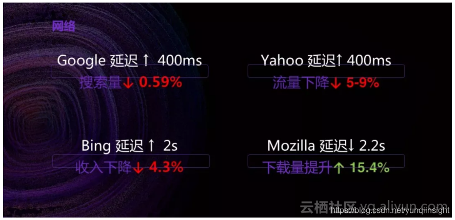 网络是所有移动App非常关键的基础模块。Google之前对搜索系统有做过相应的统计评测,搜索系统延迟每上升400毫秒,搜索量业务量就会降低0.59%,虽然这一相对值看似比较低,但是在Google搜索体量背后也是非常大的损耗。雅虎整体Web系统的延迟每上升400毫秒,流量就会下降5%到9%;Bing延迟每上升2秒,整体收入下降4.3%;而对于Mozilla,延迟每降低2.2秒,下载量就会提升15.4%。所以说网络这个环节不仅仅和移动端体验息息相关,同时也直接决定着产品的核心商业指标情况。
