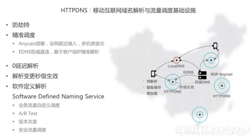 • 防劫持,因为LocalDNS环节往往没有商业化的SLA保障,而通过这样的方式可以彻底地规避域名劫持问题。同时基于全网的BGP Anycast的部署可以实现全网客户端就近接入的能力,同时通过遍及全网的多机房的容灾可以保障商业化的服务SLA。另外一方面,HTTPDNS和权威DNS之间也是通过EDNS进行直连的,这意味着可以基于客户端IP进行精准调度。在传统的DNS体系中,一般权威DNS进行调度的时候是基于LocalDNS代理节点进行调度的,一旦LocalDNS的分布不是很均匀,就会降低CDN域名解析等的精准性。