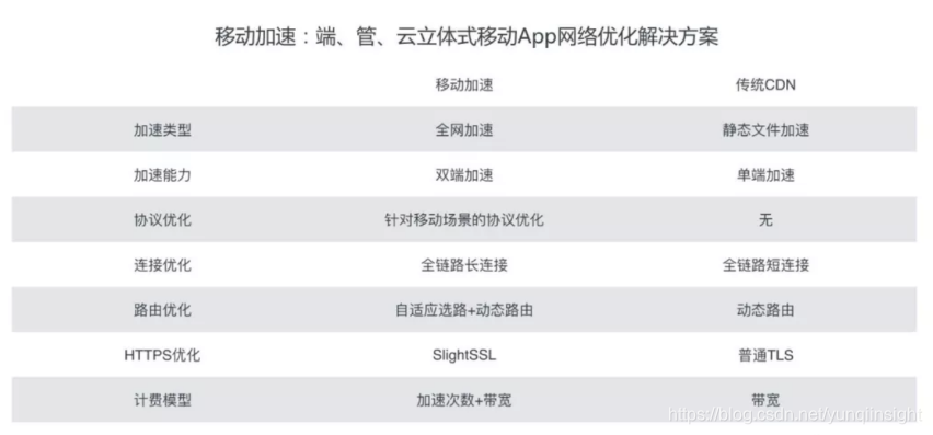 • 在“云”方面,传统CDN实现的功能是静态资源的缓存、分发能力,同样的移动加速会继承传统CDN静态资源缓存分发能力,同时对于像HTML、JS、CSS等面向Web化的资源也会进行动态的资源优化,进一步压缩链路上网络带宽的诉求,提升网络访问的效率。