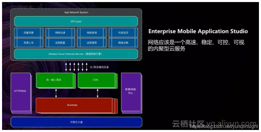 除了域名解析和网络优化之外,移动网络还有非常多的场景诉求,比如说网络拨测、网络体系监控、资源上传、远程调用、网络诊断等,移动网络本身是内聚性非常强的闭环场景。App对网络诉求可以用四个关键词概括:高速、稳定、可控,可视。
