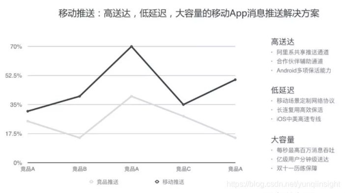 面向运营域,阿里巴巴会开放经历多年“双11”历练的消息推送系统。在送达方面开放整个阿里系共享的消息推送通道,结合厂商合作伙伴提供的基于多消息推送通道的通送解决方案保障整体送达效果。延迟方面,会针对移动网络场景进行深度优化和定制,同时面向IOS推送场景提供相应的中美高速通道专线,保障每一次任务的及时下发和网络秒级应答。在流量方面,每秒百万级别消息设备的吞吐率意味着在面对类似“双11”这样的强脉冲计算的场景下,也能够及时地对于推送业务进行应答。