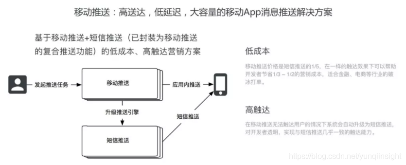 除了传统PaaS层推送通道之外还会进一步开放复合推送的能力,基于移动推送+短信推送组合面向客户提供更弹性的触达终端用户的解决方案。在复合推送的模型下,优先通过应用链的消息推送进行客户触达,在消息推送没有办法触达客户的情况下就通过短信推送进行补偿。一方面可以利用短信推送的高触达率保障营销任务的触达效果,另外一方面也可以利用消息推送本身的低成本进一步地降低营销任务背后的成本开销。