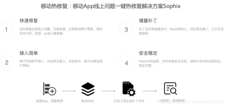 移动云面向移动App还推出了线上问题一键热修复的解决方案Sophix,针对Native App发版节奏慢,更新周期长的问题提供端到端一体化的热修复解决方案,Sophix可以面向代码、资源、SO文件三个维度进行修复,接入成本非常低廉,对应用没有侵入,几行代码可以完成整体接入,补丁包采用差量技术进行更新,从Patch生成、灰度、线上发布和统计能够帮助开发者实现一站式线上故障应急处理的解决方案。