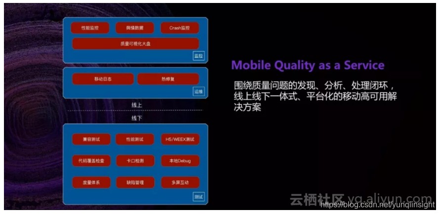 移动应用质量管理高可用这个体系类似于上述的移动网络体系,也是内聚性非常强的闭环场景,在这样的场景内阿里巴巴沉淀了非常多的能力,比如数据挖掘、分析梳理、面向终端日志采集分析处理等等。