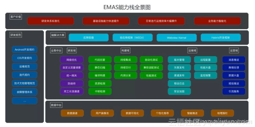 EMAS研发支撑平台覆盖从研发管理到持续集成、自动化测试、版本管理、灰度发布、监控大盘、系统运维、用户运营等完整的全流程生命周期管理,是移动互联网沉淀的这套流程、机制、方法论很重要的载体。同时配合在云上提供的移动中间件基础服务体系,可以从真正意义上面向开发者提供移动应用研发全栈解决方案。
