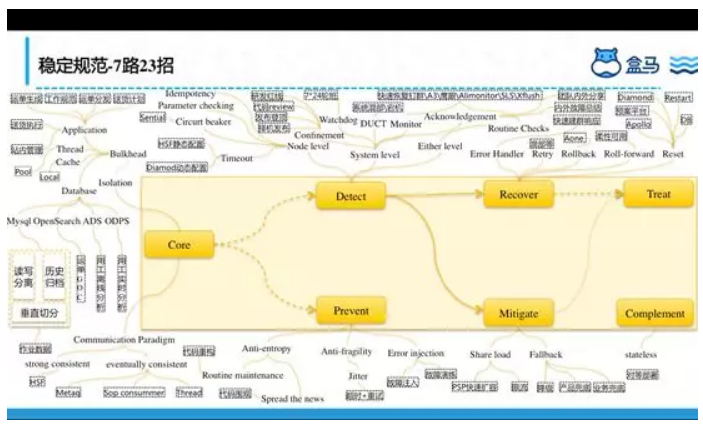 整个盒马技术部对线上/线下作业生产之关注,代码质量之高、故障处理之严,让我们工程师在反复反复地肯定自己的同时又不断地否定自己,在开发中设计重构系统,在生产之中检验系统。经过线上/线下冰与火的历练,我们淬炼出了一套稳定性的方法论,概括起来就12个字:研发规范、架构规范、稳定性规范。