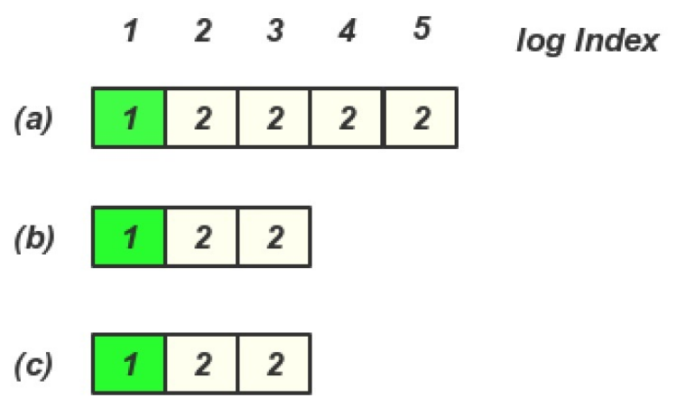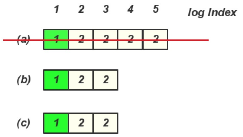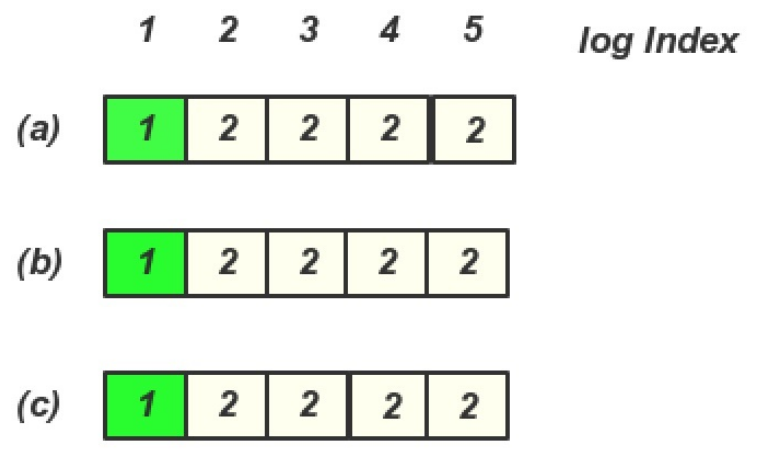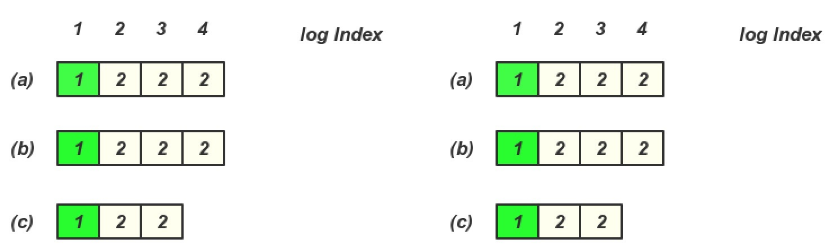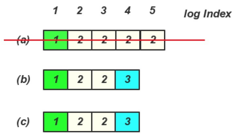 在(b)或(c) 成为Leader 期间, 没有写入任何内容, 然后(a) 又恢复, 并且又重新选主, 那么就存在一下日志, 这个时候client 再查询就查询到Log entry 4,5 里面的内容了