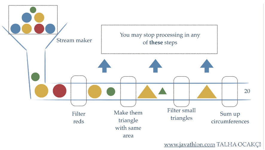 Stream有很多中间操作,多个中间操作可以连接起来形成一个流水线,每一个中间操作就像流水线上的一个工人,每人工人都可以对流进行加工,加工后得到的结果还是一个流。