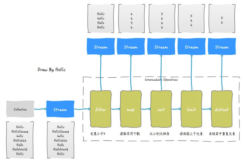 //Hollis, HollisChuang, Hollis666, Hollis接下来,我们还是使用一张图,来演示下,前文的例子中,当一个Stream先后通过filter、map、sort、limit以及distinct处理后会,在分别使用不同的最终操作可以得到怎样的结果: