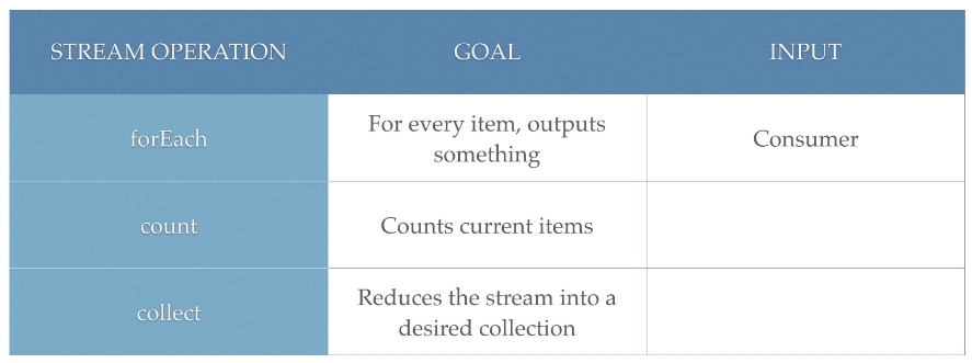 如上图,对于流的处理,主要有三种关键性操作:分别是流的创建、中间操作(intermediate operation)以及最终操作(terminal operation)。
