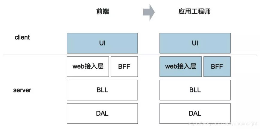 但是前端技术领域逐渐趋于稳定,伴随着十几年的发展,各种开箱即用的库、垂直方案以及工程手段唾手可得,甚至目前出现了一些辅助工具可以把设计师的视觉稿生成UI代码,前端可以安心并且以非常低的成本编写UI和业务逻辑,而不用耗费大量精力在选型、造轮、还原视觉、处理兼容性、性能优化、调试和部署上,这种情况,前后端工种分离造成的协同成本反而放大了,因为在前后端角色分离的情况下,后端往往还会充当bff层的角色,比如为前端表现层封装各种api gateway,经常出现相互等待、联调协议的情况,而且bff层通常只是一些数据的加工,其他的角色经过短期的培训可以快速上手,因此前端一直在尝试接入到server端的bff层。