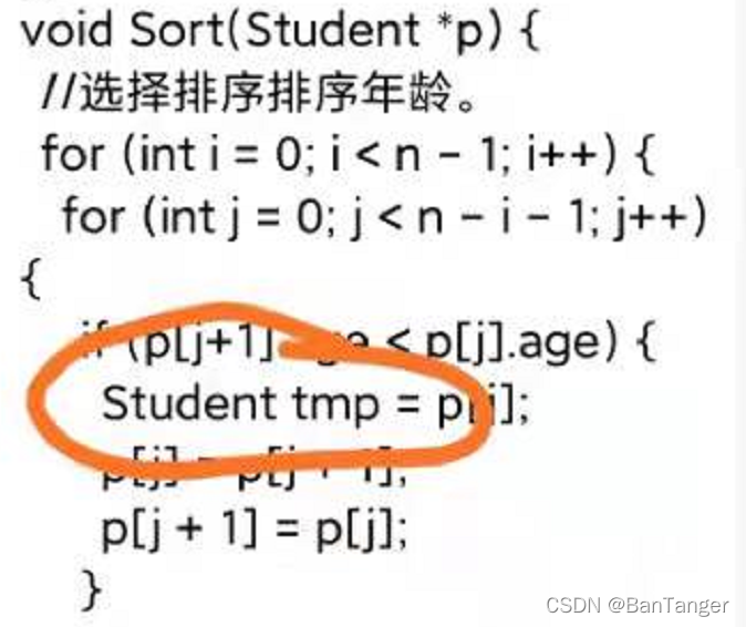 void Sort(Student *p) {//选择排序排序年龄。for (int i = 0; i < n ; i++) {for (int j = 0; j < n - i -1; j++) {if (p[j+1].age < p[j].age) {//比较的是结构体部分成员,但对整个结构体交换。则需要创建一个新的结构体。Student tmp = p[j];p[j] = p[j + 1];p[j + 1] = tmp;}}}for (int i = 0; i < n; i++) printf("%d\t%s\t%d\t%f\t\n", p[i].id,p[i].Name, p[i].age, p[i].tell);