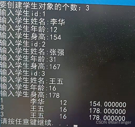 int main() {Student stu[MAX];printf("要创建学生对象的个数:");scanf("%d", &n);for (int i = 0; i < n; i++){printf("输入学生id:");scanf("%d", &stu[i].id);printf("输入学生姓名:");scanf("%s", &stu[i].Name);printf("输入学生年龄:");scanf("%d", &stu[i].age);printf("输入学生身高:");scanf("%f", &stu[i].tell);}Sort(stu);