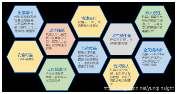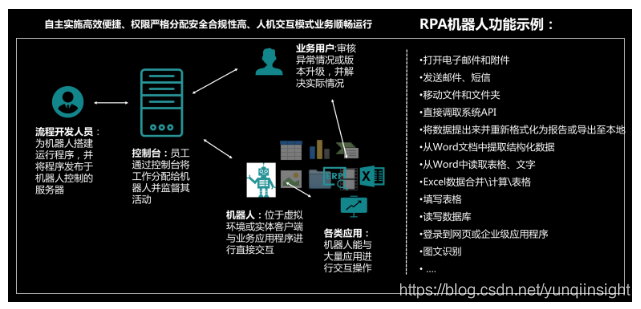 - 快速开发和高效运维 正常情况下,除去前期的服务器部署、环境安装等工作(大约需要半天时间),一个熟悉业务流程的人员开发一个中等难度的RPA应用只需要2-3天时间,然后就可以上线运行,不仅大大提升了流程的处理效率,解决了业务上的痛点,而且后续应用的修改和运维工作也相当便捷。同样的业务如果换成传统的开发模式进行(比如Java,C#等),开发周期会成倍数的增加。 RPA的优势很多,此文无法一一穷举,在实际的RPA案例中可以体会到RPA给企业和员工的日常工作带来的好处。