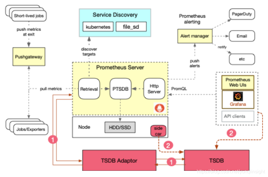 1. 使用Prometheus官方提供的开源的OpenTSDB Adapter 对接原生的Prometheus ,实现数据写入到TSDB。基本架构为: