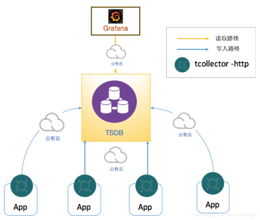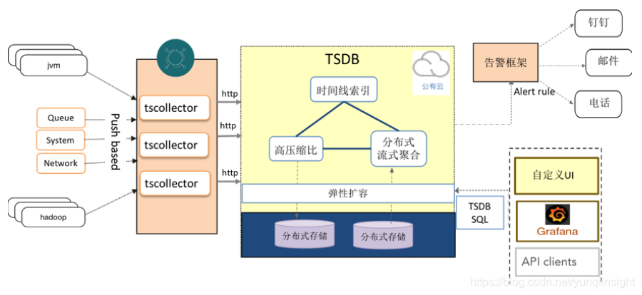 因此,基于tcollector + TSDB + Grafana的监控告警架构如下,其中tcollector以http协议从目标结点上拉取监控指标,并以http的OpenTSDB协议将指标推送至阿里云TSDB。