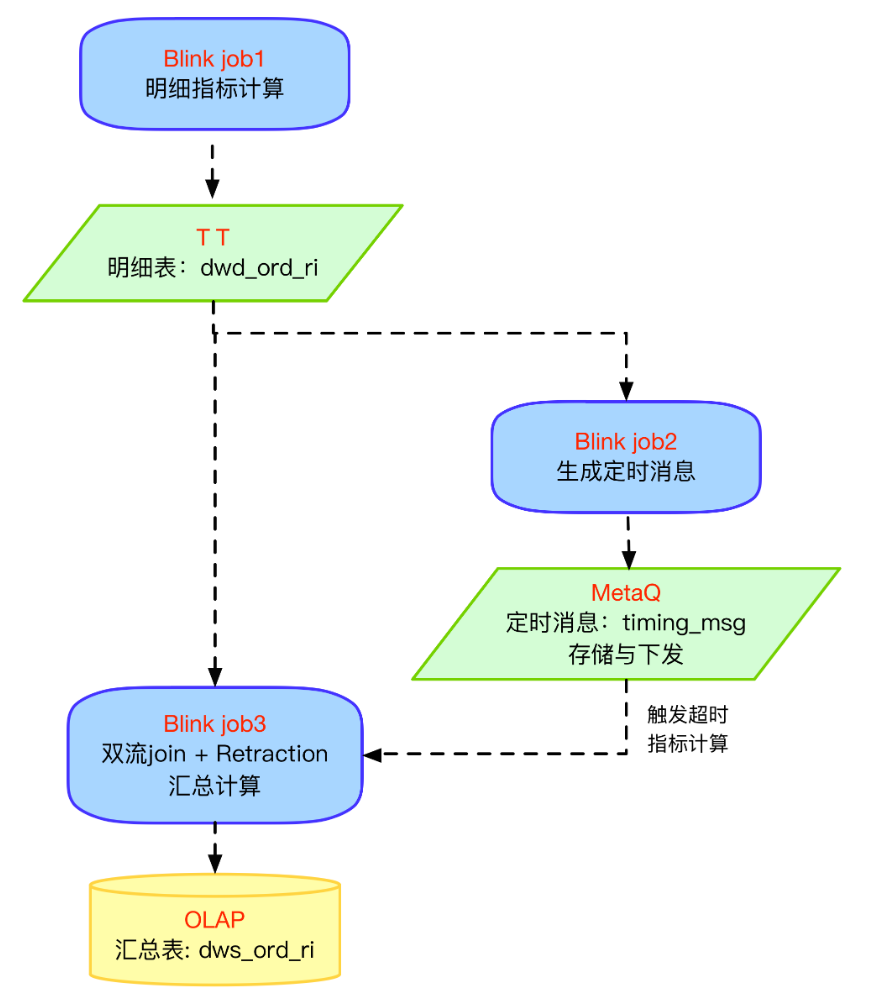 Step3:Blink job3 接收 TT、MetaQ 两个消息源,先做Join,再对time_flag判断,最后做Aggregate计算。同一笔订单,dwd_ord_ri、timing_msg任意一个消息到来,都会触发join,time_flag判断,aggregate重新计算一遍,Blink的Retraction可对结果进行实时更新。