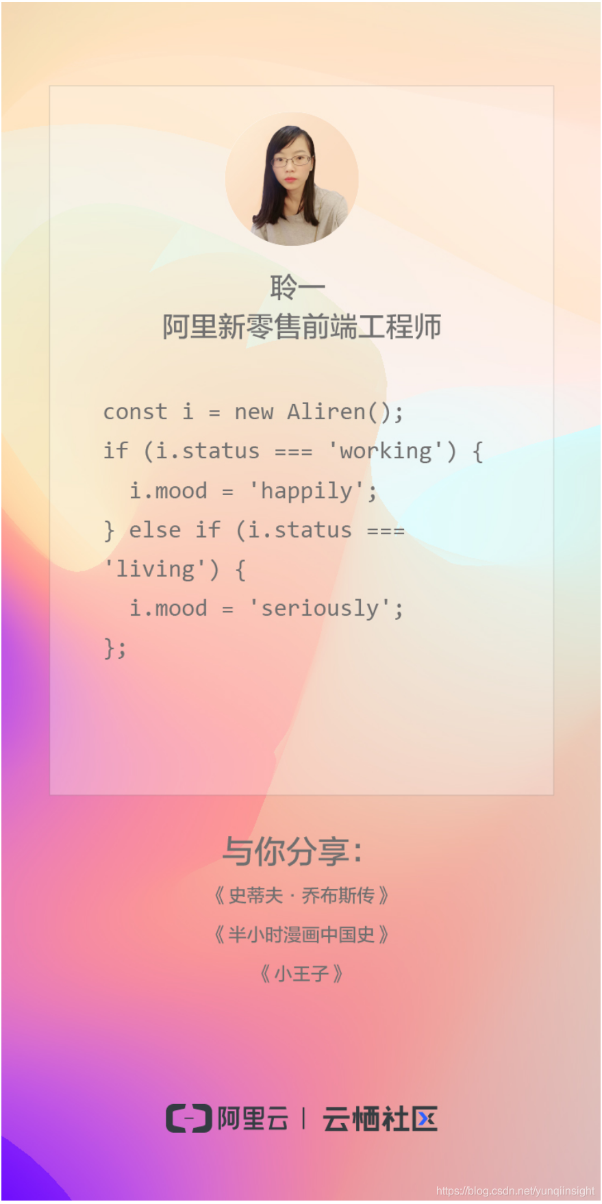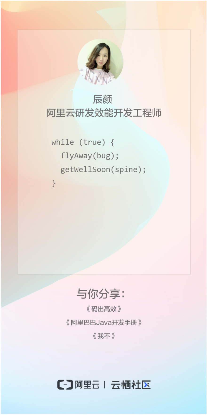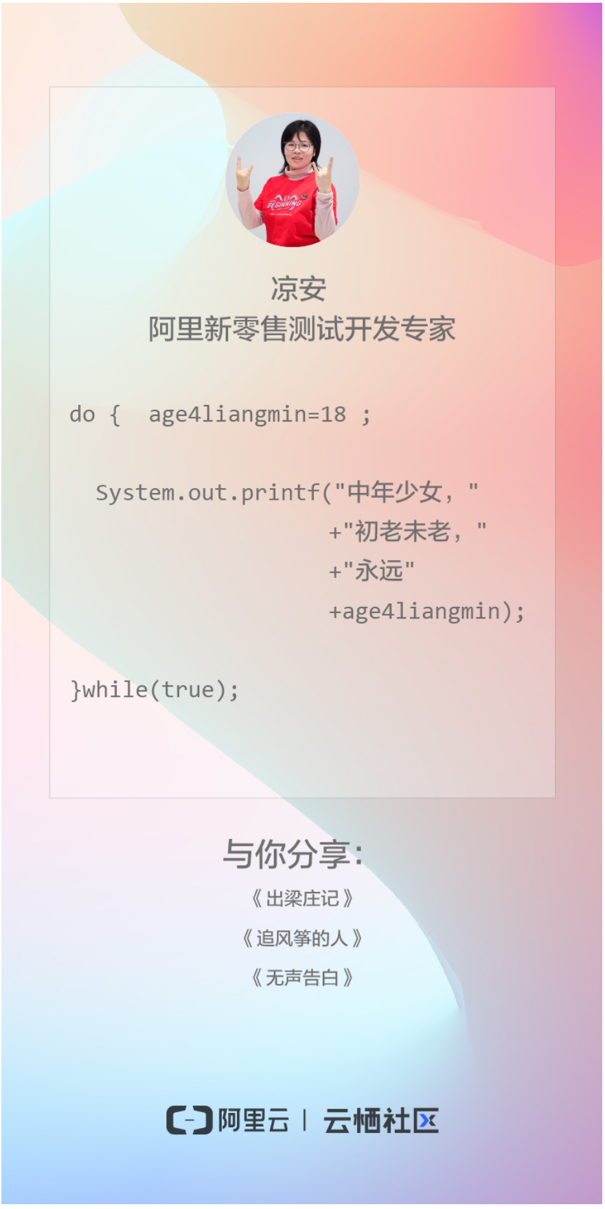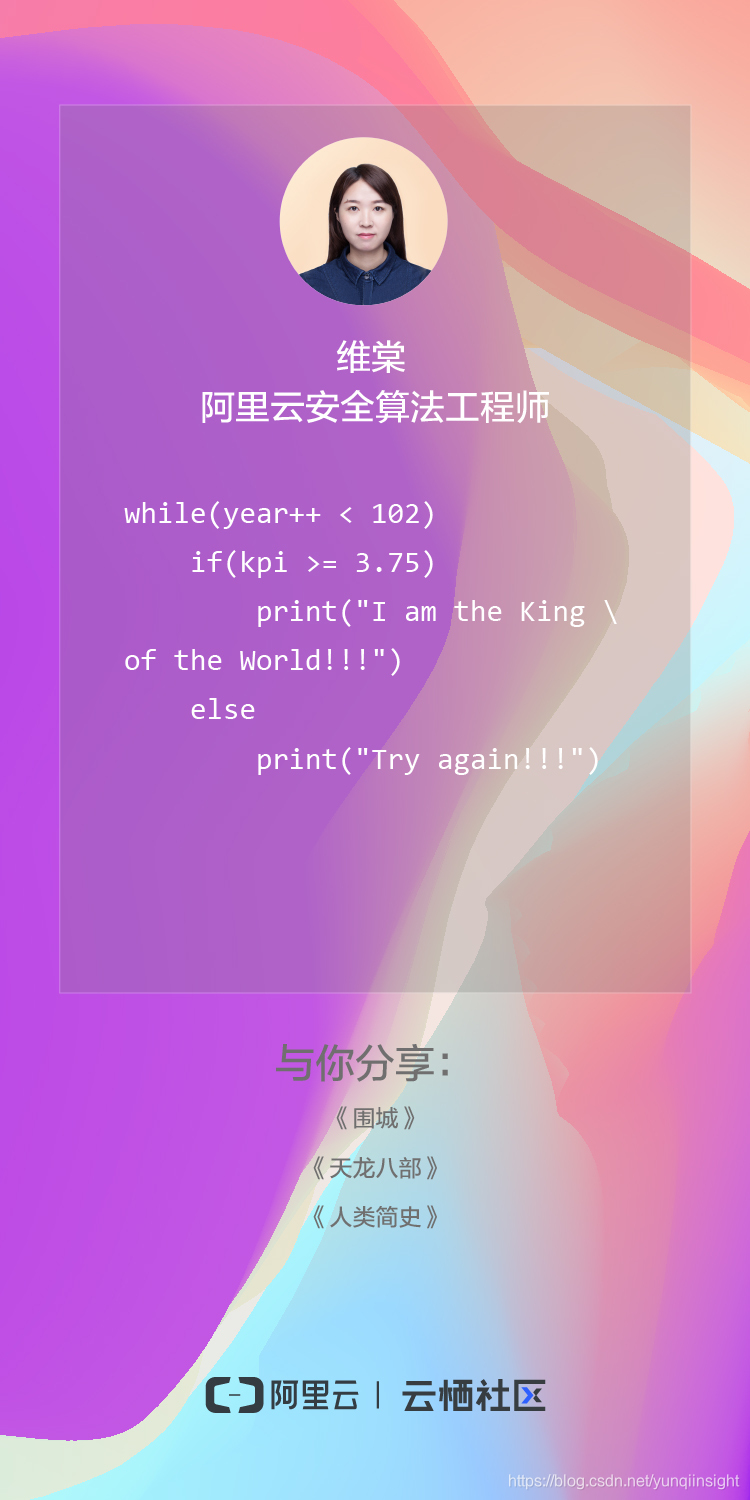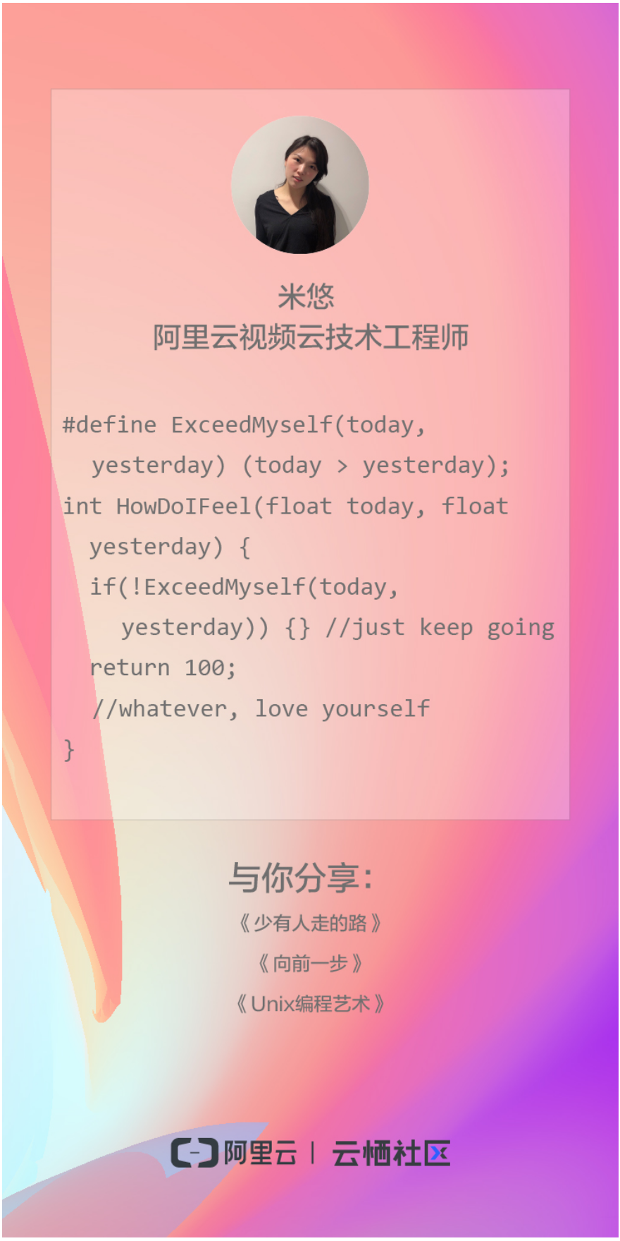 云栖社区为此推出“三七”女生节特别分享,16位才华横溢的阿里女生们同一时间分享了自己写的代码诗和她们推荐的书单,你知道这些代码的释义吗?快来解密吧!