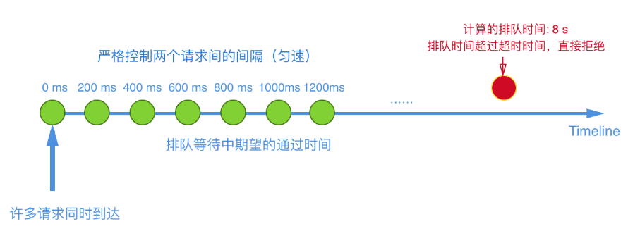 比如在 RocketMQ 的场景下配置了匀速模式下请求 QPS 为 5,则会每 200 ms 处理一条消息,多余的处理任务将排队;同时设置了超时时间,预计排队时长超过超时时间的处理任务将会直接被拒绝。示意图如下图所示: