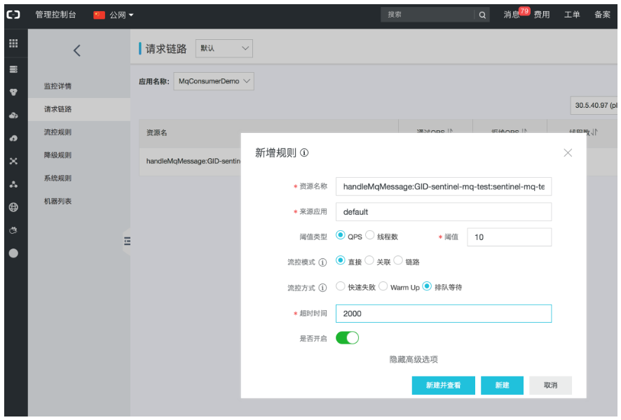 我们在“流控方式”中选择“排队等待”,设置 QPS 为 10,代表每 100ms 匀速通过一个请求;并且设置最大超时时长为 2000ms,超出此超时时间的请求将不会排队,立即拒绝。配置完成后点击新建按钮。