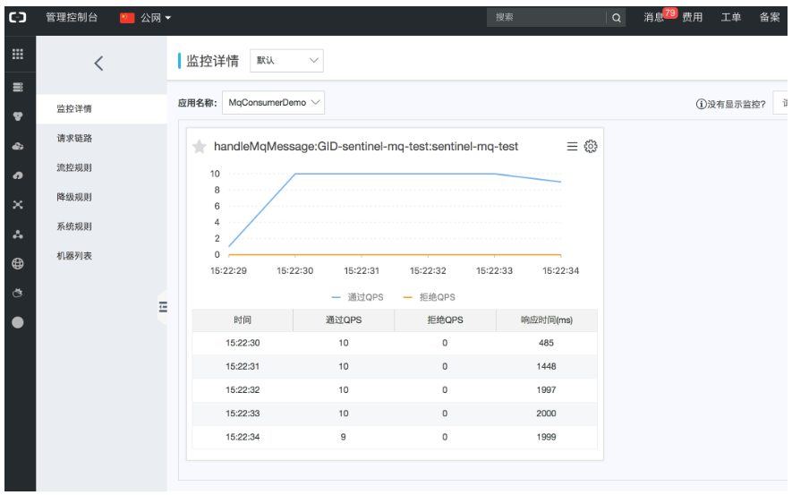 我们也可以点击左侧侧边栏的“监控详情”进入监控详情页面,查看处理消息的监控曲线: