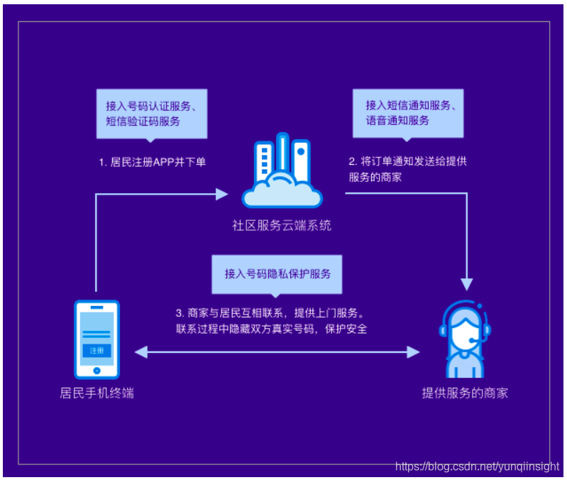 - 社区服务云端系统获取下单信息,然后以语音通知或短信通知方式,将订单发送给提供服务的商家。