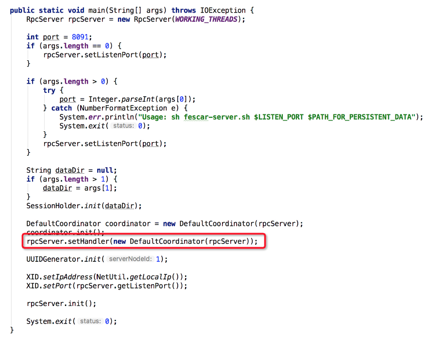上图中看出RpcServer处理通信协议相关逻辑,而对于TC模块真实处理器是DefaultCoordiantor,里面包含了所有TC对外暴露的功能,比如doGlobalBegin(全局事务创建)、doGlobalCommit(全局事务提交)、doGlobalRollback(全局事务回滚)、doBranchReport(分支事务状态上报)、doBranchRegister(分支事务注册)、doLockCheck(全局写排它锁校验)等,其中doBranchRegister、doLockCheck、doGlobalCommit就是全局写排它锁实现方案的入口。