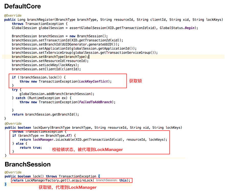 protected void doBranchRegister(BranchRegisterRequest request, BranchRegisterResponse response,RpcContext rpcContext) throws TransactionException {response.setTransactionId(request.getTransactionId());response.setBranchId(core.branchRegister(request.getBranchType(), request.getResourceId(), rpcContext.getClientId(),XID.generateXID(request.getTransactionId()), request.getLockKey()));