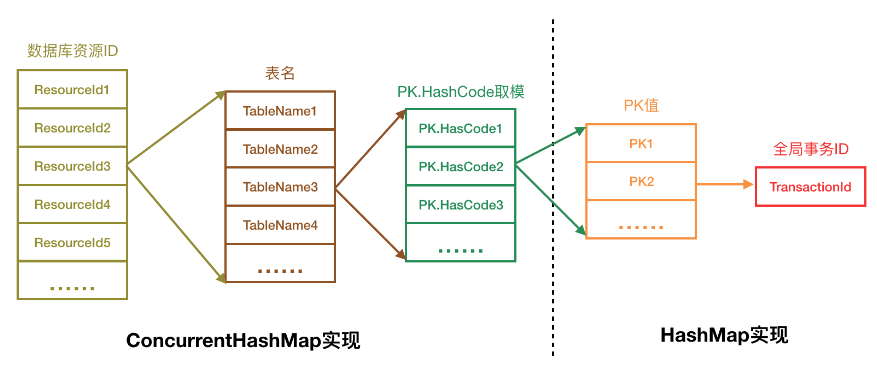 前半部分采用ConcurrentHashMap好理解:为了支持更好的并发处理;疑问的是后半部分为什么不直接采用ConcurrentHashMap,而采用HashMap呢?可能原因是因为后半部分需要去判断当前全局事务有没有占用PK对应的锁资源,是一个复合操作,即使采用ConcurrentHashMap还是避免不了要使用Synchronized加锁进行判断,还不如直接使用更轻量级的HashMap。