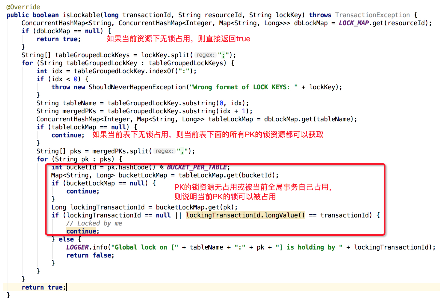 整体上,锁结构采用Map进行设计,前半段采用ConcurrentHashMap,后半段采用HashMap,最终其实就是做一个锁占用标记:在某个ResourceId(数据库源ID)上某个Tabel中的某个主键对应的行记录的全局写排它锁被哪个全局事务占用。下面,我们来看一下具体获取锁的源码: