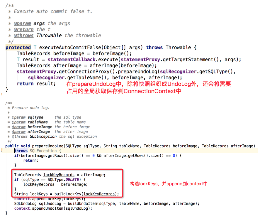 接下来我们再来看看分支事务如何提交,对于分支事务中需要占用的全局锁资源如何生成和保存的。首先,在执行SQL完业务SQL后,会根据beforeImage和afterImage生成UndoLog,与此同时,当前本地事务所需要占用的全局锁资源标识也会一同生成,保存在ContentoionProxy的ConnectionContext中,如下图所示。