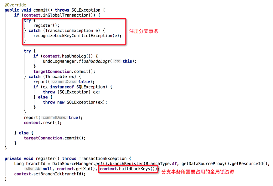 在ContentoionProxy.commit中,分支事务注册时会将ConnectionProxy中的context内保存的需要占用的全局锁标识一同传递给TC进行全局锁的获取。