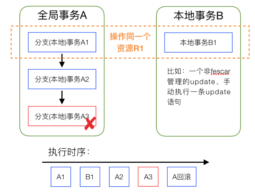 - 一个Fescar管理的全局事务和一个非Fescar管理的本地事务之间发生锁冲突怎么办?具体问题如下图,问题是:全局事务A如何回滚?
