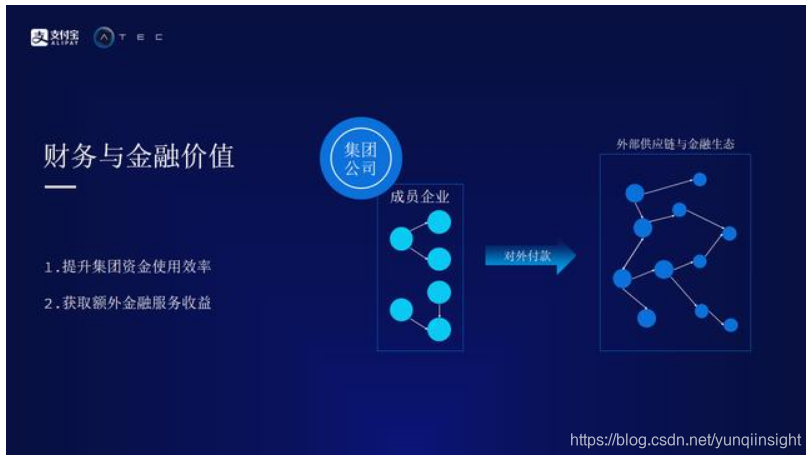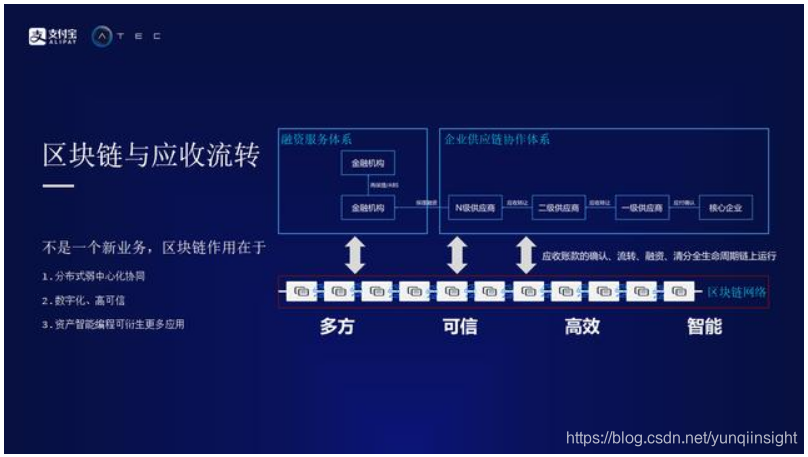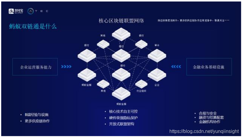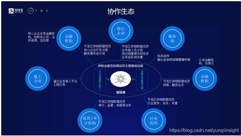 最核心的区块链联盟网络、金融业务的基础设施配套、面向企业运营服务能力的配套三者组合成为了蚂蚁金服的双链通服务,这是一个可以用多种方式组装的合作蓝图,一个由多方组成的协作网络。