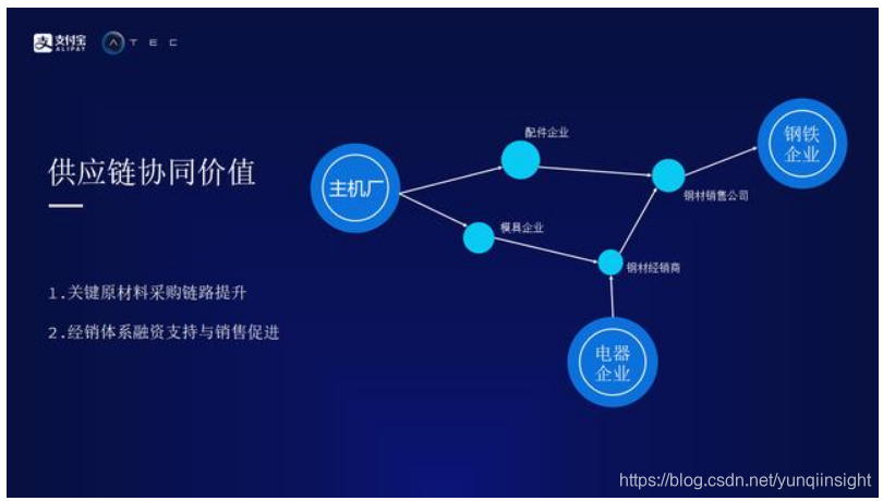 在供应链的协作方面,如何让客户企业发现潜在目标,如何让客户企业真正获得价值是一大难题。蚂蚁金服在B类客户特别中小微企业上面,拥有多年合作经验并通过大量相关基础设施作为配套开发了符合这样中小公司利益的双通链网络。