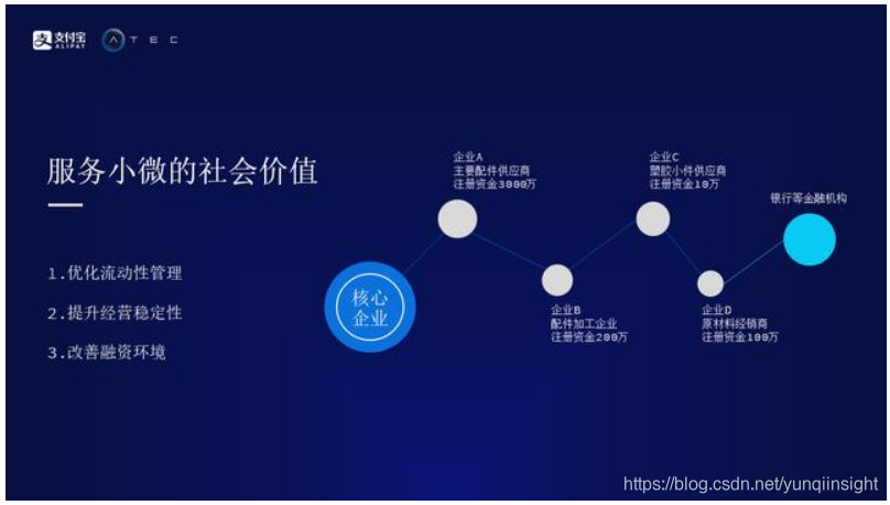 1.核心企业是蚂蚁金服最重要的合作伙伴。在这些合作伙伴当中,不仅有与蚂蚁金服合作的核心企业,还可以包括其下属的财务公司、保理公司、信托公司甚至自有的银行等。这些下属公司也可以成为蚂蚁金服区块链的联盟成员,并把核心企业的业务进行打包。