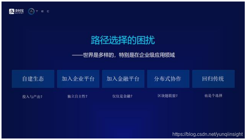 对每个企业而言,多种多样的选择带来不同的价值与代价。企业构建区块链也是如此,企业在利用区块链方式构建自己生态的同时,往往被多种多样的可选择路径困扰。这时一个十分重要的考量标准为:企业技术上、风险管控上的投入与所建立的生态产出是否匹配。