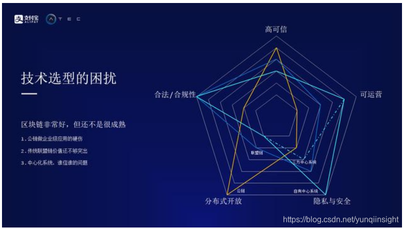 5.技术选型上的困扰。区块链技术虽然很有发展,但目前尚处于不成熟的阶段,无论公司使用公链技术、联盟链技术或是传统的中心化技术,都会面临各自的问题。如下图所示,蚂蚁金服绘制了企业所关心的雷达图,图中将区块链的优劣分为以下几大考量维度: