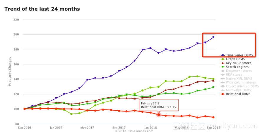 (1)规模:时间序列数据累计速度非常快。例如,一辆联网汽车每小时产生几百GB 的数据。关系型数据库处理大数据集的效果非常糟糕;NoSQ数据库可以很好地处理规模数据,但是仍然比不上一个针对时间序列数据微调过的数据库。相比之下,时间序列数据库将时间作为最高优先级来处理,通过提高区间数据实时查询效率来处理这种大规模数据,并带来性能的提升,包括:每秒写入速度,能够支撑的设备指标量,读取数据效率和非常高的存储压缩比。而时间序列数据在技术领域的关注度也日益提升。