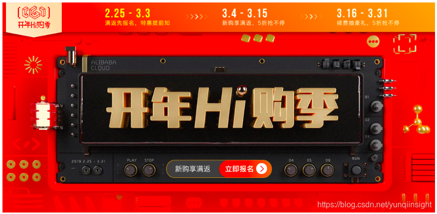 2019阿里云云上采购季活动已经于2月25日正式开启,从已开放的活动页面来看,活动分为三个阶段: 2月25日-3月04日的活动报名阶段、3月04日-3月16日的新购满返+5折抢购阶段、3月16日-3月31日的续费抽豪礼+5折抢购阶段。