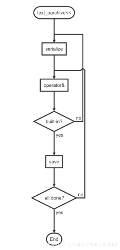 template <typename T> text_oarchive& operator&(T& v);开发者调用操作符函数<<时,需要首先回调到相应类型的模板函数serialize中