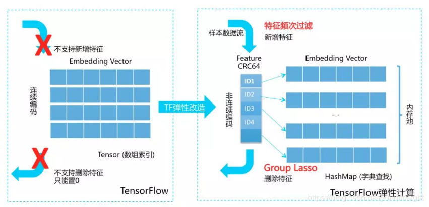 每个特征都通过hash函数映射到一个2的64次方大小的空间内。当需要计算该特征时,PS会按需惰性创建并返回之。但其上层行为与原生TF一致。由于去掉了featuremap转ID的过程,我们内部形象地将其称为“去ID化”。在此之上我们实现了Group Lasso FTRL,频次过滤和模型压缩等一系列算法。