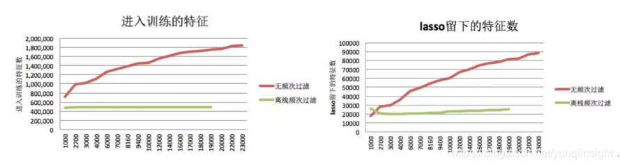 由于FTRL在设计和推导时并未明确考虑极低频特征,虽然通过增大λ,确实能去除大量极低频特征,但由于约束太强,导致部分有效特征也被lasso,在离线实验中被证明严重影响性能。其次,对这些巨量极低频特征,保存历史信息的工程代价是很高昂的(增加几倍的参数空间和存储需求),如下图: