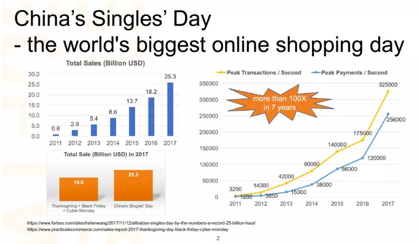 阿里最有代表性的事件是“双 11”。这里还是用的17年的数据,左上角是双十一的销售额,17年大概是 253 亿美金,比美国同期 Thanksgiving、Black Friday、Cyber Monday 加起来的销售额还要多。