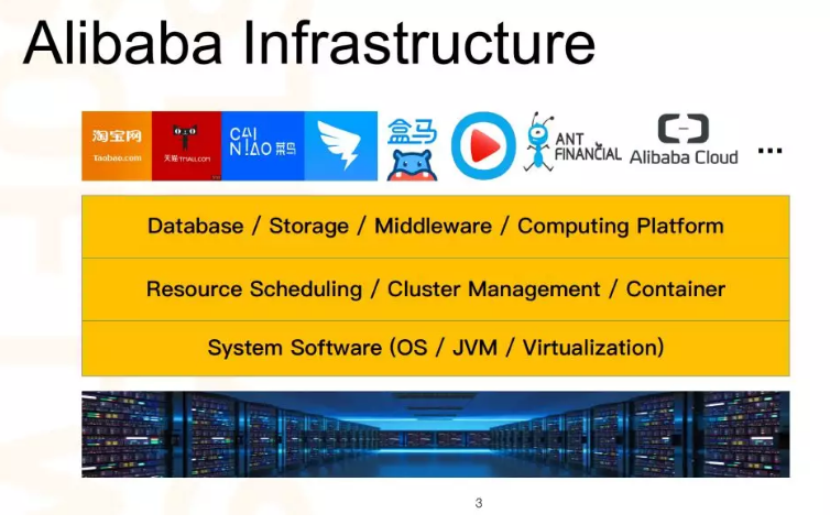 双十一零点的峰值性能不是一个简单的数字,其背后需要一个大规模数据中心来支撑。 简单来说,阿里的基础架构的上层是各种各样的应用,比如淘宝、天猫、菜鸟、钉钉,还有云计算和支付宝等,这也是阿里的一个特色,即具有丰富的业务场景。