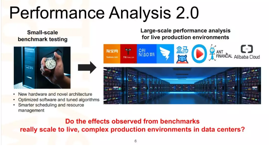 阿里的数据中心里有上万种不同的业务应用,也有上百万台分布在世界各地的不同服务器。当我们考虑在数据中心里升级改造软件或硬件时,一个关键问题是小规模基准测试的效果是否能扩展到数据中心里复杂的线上生产环境?